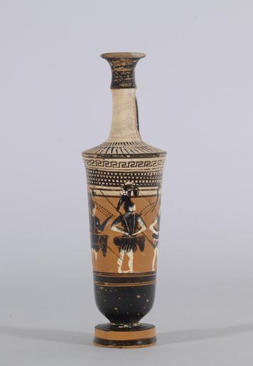 Keywords: Beldam Painter - Three Amazons - Walters 48249.jpg Three Amazons on this black-figure lekythos face right and appear to march one after the other Their skin is white but their facial features eroded or rubbed away are indistinguishable Each wears a helmet holds a long spear and has a horizontal quiver The middle figure holds both hands near her waist; the other two have one hand raised Amazons are first mentioned in the Iliad 6 186 as allies of the Trojans; later authors emphasize their fearlessness and their status as foreigners They were introduced on Attic vases in the early 6th century BC and quickly became a popular subject Early black-figure depictions of Amazons resemble Greek warriors with one notable difference-their white skin color which identifies them as women In red-figure vases the Amazons acquire more feminine features and bodies and their foreigness is emphasized by their attire Scythian or Thracian clothing and subsequently Persian garb In some places in Greece Amazons were the object of cult Jennifer Larson 1995 111-16 has suggested that despite the fact that they were considered hostile to the Greeks their complete otherness from the Greek way of life also gave them protective powers and entitled them to be worshiped as heroines ca 500 BC terracotta cm 20 5 6 accession number 48 249 62 Joseph Brummer New York date and mode of acquisition unknown Henry Walters city Baltimore Walters Art Museum Henry Walters Acquired by Henry Walters 1924 Heroes Mortals and Myths in Ancient Greece The Walters Art Museum Baltimore; Frist Center for the Visual Arts Nashville; San Diego Museum Of Art San Diego; Alexander S Onassis Public Benefit Foundation USA New York 2009-2011 place of origin Attica Greece Walters Art Museum license Ancient Greek black-figure pottery in the Walters Art Museum Beldam Painter Media contributed by the Walters Art Museum needs category review Media contributed by the Walters Art Museum needs artist update