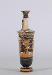 Keywords: Beldam Painter - Three Amazons - Walters 48249 - Three Quarter Left.jpg Three Amazons on this black-figure lekythos face right and appear to march one after the other Their skin is white but their facial features eroded or rubbed away are indistinguishable Each wears a helmet holds a long spear and has a horizontal quiver The middle figure holds both hands near her waist; the other two have one hand raised Amazons are first mentioned in the Iliad 6 186 as allies of the Trojans; later authors emphasize their fearlessness and their status as foreigners They were introduced on Attic vases in the early 6th century BC and quickly became a popular subject Early black-figure depictions of Amazons resemble Greek warriors with one notable difference-their white skin color which identifies them as women In red-figure vases the Amazons acquire more feminine features and bodies and their foreigness is emphasized by their attire Scythian or Thracian clothing and subsequently Persian garb In some places in Greece Amazons were the object of cult Jennifer Larson 1995 111-16 has suggested that despite the fact that they were considered hostile to the Greeks their complete otherness from the Greek way of life also gave them protective powers and entitled them to be worshiped as heroines ca 500 BC terracotta cm 20 5 6 accession number 48 249 62 Joseph Brummer New York date and mode of acquisition unknown Henry Walters city Baltimore Walters Art Museum Henry Walters Acquired by Henry Walters 1924 Heroes Mortals and Myths in Ancient Greece The Walters Art Museum Baltimore; Frist Center for the Visual Arts Nashville; San Diego Museum Of Art San Diego; Alexander S Onassis Public Benefit Foundation USA New York 2009-2011 place of origin Attica Greece Walters Art Museum license Ancient Greek black-figure pottery in the Walters Art Museum Beldam Painter Media contributed by the Walters Art Museum needs category review Media contributed by the Walters Art Museum needs artist update