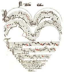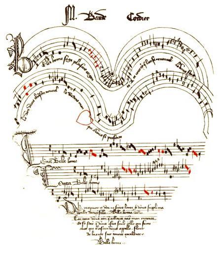 Keywords: Bellebonnesage.jpg - Score of Baude Cordier's chanson Belle bonne sage from The Chantilly Manuscript Musée Condé 564 The manuscript is one of the classic examples of ars subtilior which requires red notes or coloration to indicate changes in note lengths from their normally written values This chanson a dedicatory piece on the love of a lady and a lord written in the shape of a heart opens the corpus Note the heart of notes within the larger heart Chantilly Manuscript circa 1350 1400 Baude Cordier Pub domain thumb left 120px File CordierColor jpg PD-old DEFAULTSORT Cordier Baude Baude Cordier Hearts in art Love in art Ars subtilior Chantilly Musée Condé manuscripts |