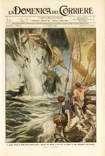 Keywords: Beltrame mine nel mare Adriatico.jpg en Scan of the first page of the edition of the La Domenica del Corriere an Italian magazine with a drawing of Achille Beltrame depicting an Italian fishing vessel destroyed by Austrian naval mines Adriatic Sea - 1914 it Scansione della prima pagina della rivista La Domenica del Corriere dell'11 ottobre 1914 con una illustrazione di Achille Beltrame raffigurante una nave di pescatori italiani distrutta dalle mine navali austriache 1914-10-11 Scan of the first page of the edition of the La Domenica del Corriere an Italian magazine 1916 Achille Beltrame 1871-1945 other versions PD-Art La Domenica del Corriere covers by Achille Beltrame World War I in October 1914 Naval mines Uploaded with UploadWizard 1914 La Domenica del Corriere |