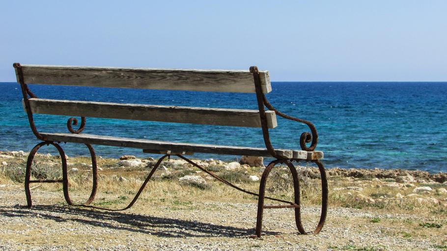 Keywords: bench rusty weathered sea beach blue solitude horizon