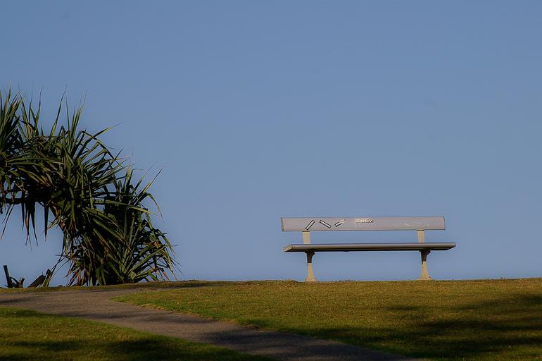 Keywords: bench seat horizon palm tree sky blue grass empty rest