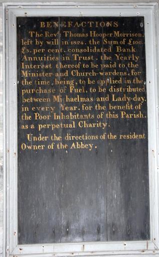 Keywords: BenefactionsBoard RevThomasHooperMorrison HartlandChurch Devon.JPG en Inscribed board in Tower of St Nectan's Church Hartland Devon publicly proclaiming the benefaction of Rev Thomas Hooper Morrison 1768-1824 of Yeo Vale Alwington Devon who inherited Hartland Abbey from his uncle Paul II Orchard 1739-1812 whose benefactions are similarly recorded on an adjacent board Inscribed Benefactions The Rev<sup>d</sup> Thomas Hooper Morrison left by will in 1824 the sum of £100 £3 per cent Consolidated Bank Annuities in trust the yearly interest thereof to be paid to the Minister and Church-Wardens for the time being to be applied in the purchase of fuel to be distributed between Michaelmas and Lady Day in every year for the benefit of the poor inhabitants of this parish as a perpetual charity Under the directions of the resident owner of the Abbey own photo Lobsterthermidor <span class signature-talk ></span> 15 48 2 April 2015 UTC after 1824 ; photo 2015 PD-old-100 St Nectan's Church Hartland interior |