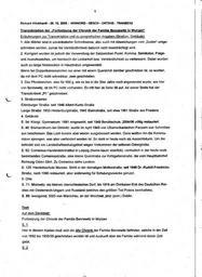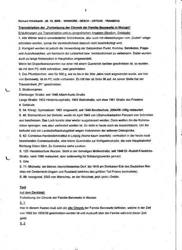 Keywords: Bennewitz Fortsetzung der Chronik zusammengefasst 0000.jpg Bennewitz - Chronik einer Kürschnerfamilie Abschrift der Seite siehe unten Dieser Teil ist überschrieben mit <br/>Fortsetzung der Chronik der Familie Bennewitz in Wurzen Hier in diesem Kasten muß sich die alte Chronik der Familie Bennewitz befinden welche in der Zeit von 1692 bis 1835/39 geschrieben worden ist und Auskunft über die Familie während dieser Zeit gibt Um die Chronik der Familie Bennewitz deren alte Aufzeichnungen vom Jahre 1692 bis 1835/39 sich in dem Buche befinden welches sich in dem vorhergehenden Kasten befindet fortführen zu können ließ ich dieses Buch anfertigen weil das alte Buch keine alten Blätter mehr hatte <br/> Wurzen im August 1909 Ernst Oskar Bennewitz Neun Generationen Kürschnermeister Bennewitz in Wurzen seit 1652 bis zur Flucht 1952 immer an gleicher Stelle Albert-Kuntz-Straße 1 Ecke Schuhgasse Anschließend in Frankfurt/Main Die zehnte Generation Otto Bennewitz jetzt 2010 in Garmisch-Partenkirchen das Haus ist wieder in Familienbesitz Nachfolgend die nochmalige mit einem Texterkennungsprogramm gelesene unkorrigierte Abschrift der abgebildeten Seite Blatt 1 der Abschrift Richard Klinkhardt “ 26 12 2005 - WINWORD - GESCH - ORTSGE TRANBEN2 Transkription der Fortsetzung der Chronik der Familie Bennewitz in Wurzen Erläuterungen zur Transkription und zu geografischen Angaben Straßen Gebäude 1 Alle Wörter sind in unveränderter Schreibweise also auch mit Abweichungen vom žDuden umgeschrieben worden zumal die Verständlichkeit dadurch nicht beeinträchtigt wird 2 Korrigiert worden ist jedoch die Verwendung der Satzzeichen Punkt Komma Semikolon Frage-und Ausrufezeichen um hierdurch die Lesbarkeit bzw Verständlichkeit zu verbessern Dabei wurden auch zu lange Nebensätze in Hauptsätze umgewandelt Wenn bei Doppelkonsonanten nur einer mit einem Querstrich darüber geschrieben ist so wurden da mit dem PC nicht schreibbar zwei geschrieben 3 Das Pfundzeichen also für 500 g wie es bis in die 1930er Jahre noch angewendet wurde wie hier von Bennewitz ist im PC nicht vorhanden Es tritt hier ab Seite 96 auf An seiner Stelle hat der Transkribent žPf geschrieben 3 Straßennamen Eilenburger Straße seit 1946 Albert-Kuntz-Straße Lange Straße 1933 Hindenburgstraße 1945 Stalinstraße seit etwa 1961 Straße des Friedens 4 Gebäude S 54 König' Gymnasium 1881 eingeweiht seit 1949 Berufsschule 2004/06 völlig restauriert S 46 Bismarckturm bei Dehnitz wurde im April 1945 von USamerikanischen Panzern von Schmölen aus beschossen Das Loch konnte aber wieder ausgebessert werden Dann wollten ihn die Kommunisten sprengen was aber verhindert worden ist So steht er heute noch als Aussichtsturm Um ihn befindet sich ein Landschaftsschutzgebiet wegen Vorkommen der seltenen Osterglocke S 62 Comenius-Handelslehrinstitut in Leipzig Name kaum leserlich vermutlich in der heute noch bestehenden Comeniusstraße eine kleine Querstraße zur Kohlgartenstraße die vom Hauptbahnhof Richtung Osten führt Zu Comenius siehe Lexikon S 120 Handelsschule Wurzen Steht in der damaligen Moltkestraße seit 1946 Dr -Rudolf-Friedrichs- Straße nach 1990 restauriert aber anderweitig für Schulungszwecke genutzt 5 Orte S 71 Mislowitz ein kleines oberschlesisches Dorf bis 1918 am Dreikaiser-Eck des Deutschen Reiches mit Oesterreich-Ungarn und Russland Welches den größten Teil Polens beinhaltete S 89 lwangorod SSO von Warschau an der Weichsel jetzt poln Deblin Text Auf dem Deckblatt Fortsetzung der Chronik der Familie Bennewitz in Wurzen S 1 Hier in diesem Kasten muß sich die alte Chronik der Familie Bennewitz befinden welche in der Zeit von 1692 bis 1835/39 geschrieben worden ist und Auskunft über die Familie während dieser Zeit giebt S 2 seealso category Furriers Bennewitz in Wurzen Germany Weitere Bilder und Familien- und Firmenchronik Furrier family Bennewitz in Wurzen Germany since 1652 Own Begonnen 1909 Bennew <span class signature-talk >talk</span> 15 04 7 June 2010 UTC Fortsetzung der Chronik der Familie Bennewitz in Wurzen Comeniusstraße Leipzig |