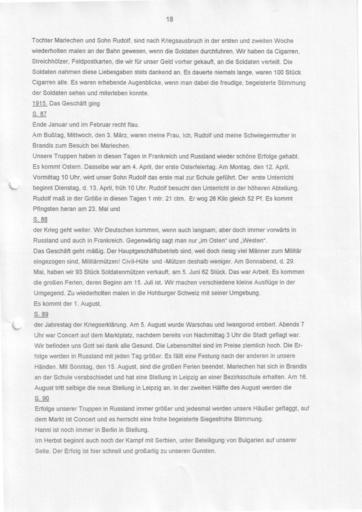 Keywords: Bennewitz Fortsetzung der Chronik zusammengefasst 0017.jpg Bennewitz - Chronik einer Kürschnerfamilie Abschrift der Seite siehe unten Dieser Teil ist überschrieben mit <br/>Fortsetzung der Chronik der Familie Bennewitz in Wurzen Hier in diesem Kasten muß sich die alte Chronik der Familie Bennewitz befinden welche in der Zeit von 1692 bis 1835/39 geschrieben worden ist und Auskunft über die Familie während dieser Zeit gibt Um die Chronik der Familie Bennewitz deren alte Aufzeichnungen vom Jahre 1692 bis 1835/39 sich in dem Buche befinden welches sich in dem vorhergehenden Kasten befindet fortführen zu können ließ ich dieses Buch anfertigen weil das alte Buch keine alten Blätter mehr hatte <br/> Wurzen im August 1909 Ernst Oskar Bennewitz Neun Generationen Kürschnermeister Bennewitz in Wurzen seit 1652 bis zur Flucht 1952 immer an gleicher Stelle Albert-Kuntz-Straße 1 Ecke Schuhgasse Anschließend in Frankfurt/Main Die zehnte Generation Otto Bennewitz jetzt 2010 in Garmisch-Partenkirchen das Haus ist wieder in Familienbesitz Nachfolgend die nochmalige mit einem Texterkennungsprogramm gelesene unkorrigierte Abschrift der abgebildeten Seite Blatt 18 der Abschrift Tochter Mariechen und Sohn Rudolf sind nach Kriegsausbruch in der ersten und zweiten Woche wiederholten malen an der Bahn gewesen wenn die Soldaten durchfuhren Wir haben da Cigarren Streichhölzer Feldpostkarten die wir für unser Geld vorher gekauft an die Soldaten verteilt Die Soldaten nahmen diese Liebesgaben stets dankend an Es dauerte niemals lange waren 100 Stück Cigarren alle Es waren erhebende Augenblicke wenn man dabei die freudige begeisterte Stimmung der Soldaten sehen und miterleben konnte 1915 Das Geschäft ging S 87 Ende Januar und im Februar recht flau Am Bußtag Mittwoch den 3 März waren meine Frau Ich Rudolf und meine Schwiegermutter in Brandis zum Besuch bei Mariechen Unsere Truppen haben in diesen Tagen in Frankreich und Russland wieder schöne Erfolge gehabt Es kommt Ostern Dasselbe war am 4 April der erste Osterfeiertag Am Montag den 12 April Vormittag 10 Uhr wird unser Sohn Rudolf das erste mal zur Schule geführt Der erste Unterricht beginnt Dienstag d 13 April früh 10 Uhr Rudolf besucht den Unterricht in der höheren Abteilung Rudolf maß in der Größe in diesen Tagen 1 mtr 21 ctm Er wog 26 Kilo gleich 52 Pf Es kommt Pfingsten heran am 23 Mai und S 88 der Krieg geht weiter Wir Deutschen kommen wenn auch langsam aber doch immer vorwärts in Russland und auch in Frankreich Gegenwärtig sagt man nur žim Osten und žWesten Das Geschäft geht mäßig Der Hauptgeschäftsbetrieb sind weil doch riesig viel Männer zum Militär eingezogen sind Militärmützen Civil-Hüte und -Mützen deshalb weniger Am Sonnabend d 29 Mai haben wir 93 Stück Soldatenmützen verkauft am 5 Juni 62 Stück Das war Arbeit Es kommen die großen Ferien deren Beginn am 15 Juli ist Wir machen verschiedene kleine Ausflüge in der Umgegend Zu wiederholten malen in die Hohburger Schweiz mit seiner Umgebung Es kommt der 1 August S 89 der Jahrestag der Kriegserklärung Am 5 August wurde Warschau und lwangorod erobert Abends 7 Uhr war Concert auf dem Marktplatz nachdem bereits von Nachmittag 3 Uhr die Stadt geflagt war Wir befinden uns Gott sei dank alle Gesund Die Lebensmittel sind im Preise ziemlich hoch Die Erfolge werden in Russland mit jeden Tag größer Es fällt eine Festung nach der anderen in unsere Händen Mit Sonntag den 15 August sind die großen Ferien beendet Mariechen hat sich in Brandis an der Schule verabschiedet und hat eine Stellung in Leipzig an einer Bezirksschule erhalten Am 16 August tritt selbige die neue Stellung in Leipzig an In der zweiten Hälfte des August werden die S 90 Erfolge unserer Truppen in Russland immer größer und jedesmal werden unsere Häußer geflaggt auf dem Markt ist Concert und es herrscht eine frohe begeisterte Siegesfrohe Stimmung Hanni ist noch immer in Berlin in Stellung Im Herbst beginnt auch noch der Kampf mit Serbien unter Beteiligung von Bulgarien auf unserer Seite Der Erfolg ist hier schnell und großartig zu unseren Gunsten seealso category Furriers Bennewitz in Wurzen Germany Weitere Bilder und Familien- und Firmenchronik Furrier family Bennewitz in Wurzen Germany since 1652 Own Begonnen 1909 Bennew <span class signature-talk >talk</span> 15 04 7 June 2010 UTC Fortsetzung der Chronik der Familie Bennewitz in Wurzen |