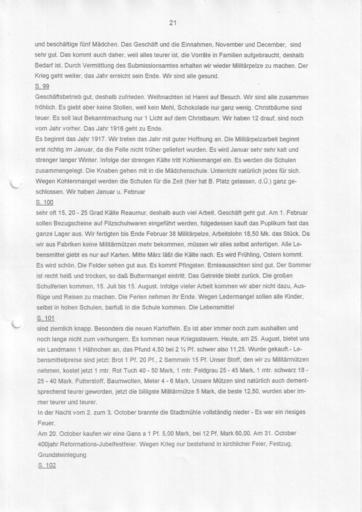 Keywords: Bennewitz Fortsetzung der Chronik zusammengefasst 0020.jpg Bennewitz - Chronik einer Kürschnerfamilie Abschrift der Seite siehe unten Dieser Teil ist überschrieben mit <br/>Fortsetzung der Chronik der Familie Bennewitz in Wurzen Hier in diesem Kasten muß sich die alte Chronik der Familie Bennewitz befinden welche in der Zeit von 1692 bis 1835/39 geschrieben worden ist und Auskunft über die Familie während dieser Zeit gibt Um die Chronik der Familie Bennewitz deren alte Aufzeichnungen vom Jahre 1692 bis 1835/39 sich in dem Buche befinden welches sich in dem vorhergehenden Kasten befindet fortführen zu können ließ ich dieses Buch anfertigen weil das alte Buch keine alten Blätter mehr hatte <br/> Wurzen im August 1909 Ernst Oskar Bennewitz Neun Generationen Kürschnermeister Bennewitz in Wurzen seit 1652 bis zur Flucht 1952 immer an gleicher Stelle Albert-Kuntz-Straße 1 Ecke Schuhgasse Anschließend in Frankfurt/Main Die zehnte Generation Otto Bennewitz jetzt 2010 in Garmisch-Partenkirchen das Haus ist wieder in Familienbesitz Nachfolgend die nochmalige mit einem Texterkennungsprogramm gelesene unkorrigierte Abschrift der abgebildeten Seite Blatt 21 der Abschrift und beschäftige fünf Mädchen Das Geschäft und die Einnahmen November und December sind sehr gut Das kommt auch daher weil alles teurer ist die Vorräte in Familien aufgebraucht deshalb Bedarf ist Durch Vermittlung des Submissionsamtes erhalten wir wieder Militärpelze zu machen Der Krieg geht weiter das Jahr erreicht sein Ende Wir sind alle gesund S 99 Geschäftsbetrieb gut deshalb zufrieden Weihnachten ist Hanni auf Besuch Wir sind alle zusammen fröhlich Es giebt aber keine Stollen weil kein Mehl Schokolade nur ganz wenig Christbäume sind teuer Es soll laut Bekanntmachung nur 1 Licht auf dem Christbaum Wir haben 12 drauf sind noch vom Jahr vorher Das Jahr 1916 geht zu Ende Es beginnt das Jahr 1917 Wir treten das Jahr mit guter Hoffnung an Die Militärpelzarbeit beginnt erst richtig im Januar da die Felle nicht früher geliefert wurden Es wird Januar sehr sehr kalt und strenger langer Winter Infolge der strengen Kälte tritt Kohlenmangel ein Es werden die Schulen zusammengelegt Die Knaben gehen mit in die Mädchenschule Unterricht natürlich jedes für sich Wegen Kohlenmangel werden die Schulen für die Zeit hier hat B Platz gelassen d à ganz geschlossen Wir haben Januar u Februar S 100 sehr oft 15 20 - 25 Grad Kälte Reaumur deshalb auch viel Arbeit Geschäft geht gut Am 1 Februar sollen Bezugscheine auf Filzschuhwaren eingeführt werden folgedessen kauft das Puplikum fast das ganze Lager aus Wir fertigten bis Ende Februar 38 Militärpelze Arbeitslohn 18 50 Mk das Stück Da wir aus Fabriken keine Militärmützen mehr bekommen müssen wir alles selbst anfertigen Alle Lebensmittel giebt es nur auf Karten Mitte März läßt die Kälte nach Es wird Frühling Ostern kommt Es wird schön Die Felder sehen gut aus Es kommt Pfingsten Ernteaussichten sind gut Der Sommer ist recht heiß und trocken so daß Buttermangel eintritt Das Getreide bleibt zurück Die großen Schulferien kommen 15 Juli bis 15 August Infolge vieler Arbeit kommen wir aber nicht dazu Ausflüge und Reisen zu machen Die Ferien nehmen ihr Ende Wegen Ledermangel sollen alle Kinder selbst in hohen Schulen barfuß in die Schule kommen Die Lebensmittel S 101 sind ziemlich knapp Besonders die neuen Kartoffeln Es ist aber immer noch zum aushalten und noch lange nicht zum verhungern Es kommen neue Kriegssteuern Heute am 25 August bietet uns ein Landmann 1 Hähnchen an das Pfund 4 50 bei 2 1/2 Pf schwer also 11 25 Wurde gekauft - Lebensmittelpreise sind jetzt Brot 1 Pf 20 Pf 2 Semmeln 15 Pf Unser Stoff den wir zu Militärmützen nehmen kostet jetzt 1 mtr Rot Tuch 40 - 50 Mark 1 mtr Feldgrau 25 - 45 Mark 1 mtr schwarz 18' 25 - 40 Mark Futterstoff Baumwollen Meter 4 - 6 Mark Unsere Mützen sind natürlich auch dementsprechend teurer geworden jetzt die billigste Militärmütze 5 Mark die beste 12 50 wurden aber immer teurer und teurer In der Nacht vom 2 zum 3 October brannte die Stadtmühle vollständig nieder - Es war ein riesiges Feuer Am 20 October kaufen wir eine Gans a 1 Pf 5 00 Mark bei 12 Pf Mark 60 00 Am 31 October 400jahr Reformations-Jubelfestfeier Wegen Krieg nur bestehend in kirchlicher Feier Festzug Grundsteinlegung S 102 seealso category Furriers Bennewitz in Wurzen Germany Weitere Bilder und Familien- und Firmenchronik Furrier family Bennewitz in Wurzen Germany since 1652 Own Begonnen 1909 Bennew <span class signature-talk >talk</span> 15 04 7 June 2010 UTC Fortsetzung der Chronik der Familie Bennewitz in Wurzen |