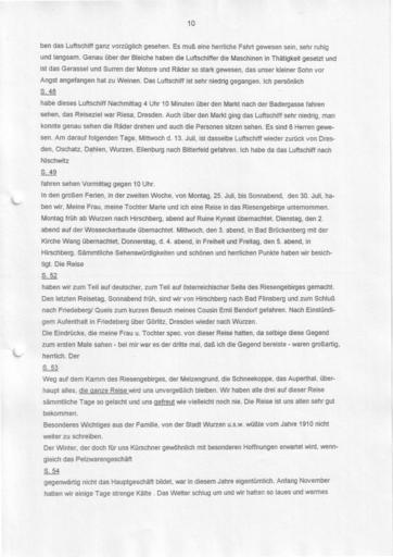 Keywords: Bennewitz Fortsetzung der Chronik zusammengefasst 0009.jpg Bennewitz - Chronik einer Kürschnerfamilie Abschrift der Seite siehe unten Dieser Teil ist überschrieben mit <br/>Fortsetzung der Chronik der Familie Bennewitz in Wurzen Hier in diesem Kasten muß sich die alte Chronik der Familie Bennewitz befinden welche in der Zeit von 1692 bis 1835/39 geschrieben worden ist und Auskunft über die Familie während dieser Zeit gibt Um die Chronik der Familie Bennewitz deren alte Aufzeichnungen vom Jahre 1692 bis 1835/39 sich in dem Buche befinden welches sich in dem vorhergehenden Kasten befindet fortführen zu können ließ ich dieses Buch anfertigen weil das alte Buch keine alten Blätter mehr hatte <br/> Wurzen im August 1909 Ernst Oskar Bennewitz Neun Generationen Kürschnermeister Bennewitz in Wurzen seit 1652 bis zur Flucht 1952 immer an gleicher Stelle Albert-Kuntz-Straße 1 Ecke Schuhgasse Anschließend in Frankfurt/Main Die zehnte Generation Otto Bennewitz jetzt 2010 in Garmisch-Partenkirchen das Haus ist wieder in Familienbesitz Nachfolgend die nochmalige mit einem Texterkennungsprogramm gelesene unkorrigierte Abschrift der abgebildeten Seite Blatt 10 der Abschrift -ben das Luftschiff ganz vorzüglich gesehen Es muß eine herrliche Fahrt gewesen sein sehr ruhig und langsam Genau über der Bleiche haben die Luftschiffer die Maschinen in Thätigkeit gesetzt und ist das Gerassel und Surren der Motore und Räder so stark gewesen das unser kleiner Sohn vor Angst angefangen hat zu Weinen Das Luftschiff ist sehr niedrig gegangen Ich persönlich S 48 habe dieses Luftschiff Nachmittag 4 Uhr 10 Minuten über den Markt nach der Badergasse fahren sehen das Reiseziel war Riesa Dresden Auch über den Markt ging das Luftschiff sehr niedrig man konnte genau sehen die Räder drehen und auch die Personen sitzen sehen Es sind 6 Herren gewesen Am darauf folgenden Tage Mittwoch d 13 Juli ist dasselbe Luftschiff wieder zurück von Dresden Oschatz Dahlen Wurzen Eilenburg nach Bitterfeld gefahren Ich habe da das Luftschiff nach Nischwitz S 49 fahren sehen Vormittag gegen 10 Uhr In den großen Ferien in der zweiten Woche von Montag 25 Juli bis Sonnabend den 30 Juli haben wir Meine Frau meine Tochter Marie und ich eine Reise in das Riesengebirge unternommen Montag früh ab Wurzen nach Hirschberg abend auf Ruine Kynast übernachtet Dienstag den 2 abend auf der Wosseckerbaude übernachtet Mittwoch den 3 abend in Bad Brückenberg mit der Kirche Wang übemachtet Donnerstag d 4 abend in Freiheit und Freitag den 5 abend in Hirschberg Sämmtliche Sehenswürdigkeiten und schönen und herrlichen Punkte haben wir besichtigt Die Reise S 52 haben wir zum Teil auf deutscher zum Teil auf österreichischer Seite des Riesengebirges gemacht Den letzten Reisetag Sonnabend früh sind wir von Hirschberg nach Bad Flinsberg und zum Schluß nach Friedeberg/ Queis zum kurzen Besuch meines Cousin Emil Bendorf gefahren Nach Einstündigem Aufenthalt in Friedeberg über Görlitz Dresden wieder nach Wurzen Die Eindrücke die meine Frau u Tochter spec von dieser Reise hatten da selbige diese Gegend zum ersten Male sahen - bei mir war es der dritte mal daß ich die Gegend bereiste - waren großartig herrlich Der S 53 Weg auf dem Kamm des Riesengebirges der Melzengrund die Schneekoppe das Auperthal überhaupt alles die ganze Reise wird uns unvergeßlich bleiben Wir haben alle drei auf dieser Reise sämmtliche Tage so gelacht und uns gefreut wie vielleicht noch nie Die Reise ist uns allen sehr gut bekommen Besonderes Wichtiges aus der Familie von der Stadt Wurzen u s w wüßte vom Jahre 1910 nicht weiter zu schreiben Der Winter der doch für uns Kürschner gewöhnlich mit besonderen Hoffnungen erwartet wird wenngleich das Pelzwarengeschäft S 54 gegenwärtig nicht das Hauptgeschäft bildet war in diesem Jahre eigentümlich Anfang November hatten wir einige Tage strenge Kälte Das Wetter schlug um und wir hatten so laues und warmes seealso category Furriers Bennewitz in Wurzen Germany Weitere Bilder und Familien- und Firmenchronik Furrier family Bennewitz in Wurzen Germany since 1652 Own Begonnen 1909 Bennew <span class signature-talk >talk</span> 15 04 7 June 2010 UTC Fortsetzung der Chronik der Familie Bennewitz in Wurzen |