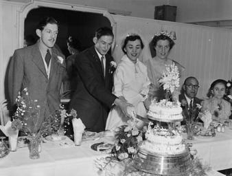 <b>Nodyn/Note:</b> Images of an unidentified bride and groom cutting the wedding cake at the wedding reception with the best man and bridesmaid standing beside them.