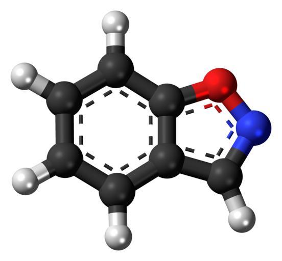 Keywords: Benzisoxazole 3D ball inverted.png Ball-and-stick model of the benzisoxazole molecule a nitrogen-oxygen heterocycle and a simple aromatic ring Colour code 505050 Carbon C black<br> F0F0F0 Hydrogen H white<br> F51E1E Oxygen O red<br> 3C50FA Nitrogen N blue<br> 2011-02-10 own DS Visualizer Jynto talk Space-filling version cc-zero Benzisoxazole Images by Jynto Ball-and-stick models |