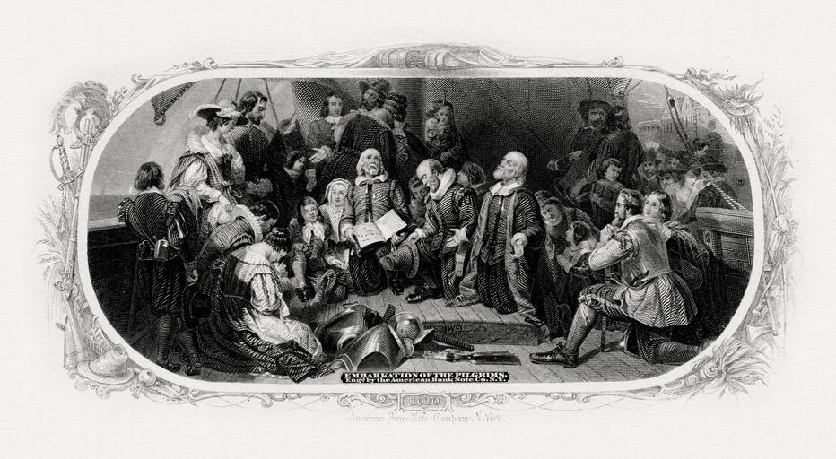 MAKE A MEME View Large Image ...Embarkation of the Pilgrims (Weir).jpg Assessments 1 Historical paintings engraved for U S banknotes LargeImage Bureau of Engraving and Printing engraved vignette of Robert W Weir ™s painting Embarkation of the Pilgrims Engraving by W W ...