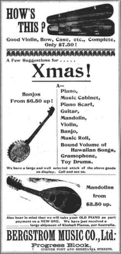 | Keywords: Bergstrom Music.jpg en George E K Awai and his Royal Hawaiian Quartet popularized the small guitar-like instrument when they performed at the Panama Pacific International Exposition at San Francisco in 1915 From then on to the early 1920s the ukulele became popular on the mainland United States A few suggestions for xmas a--piano music cabinet piano scarf guitar mandolin violin banjo music roll bound volume of Hawaiian songs gramophone toy drums Bergstrom Music Co Ltd Hawaiian star Dec 20 1911 Page 7 http //chroniclingamerica loc gov/lccn/sn82015415/1911-12-20/ed-1/seq-7/ 1911-12-20 Chronicling America - http //chroniclingamerica loc gov/ Hawaii Digital Newspaper Project - https //hdnpblog wordpress com/ unknown other versions PD-old-70-1923 Mandolin advertisements Banjos Newspaper advertising Guitar family instruments Christmas Hawaiian music Koa wood instruments Music stores 1911 in Hawaii 1910s String instruments |