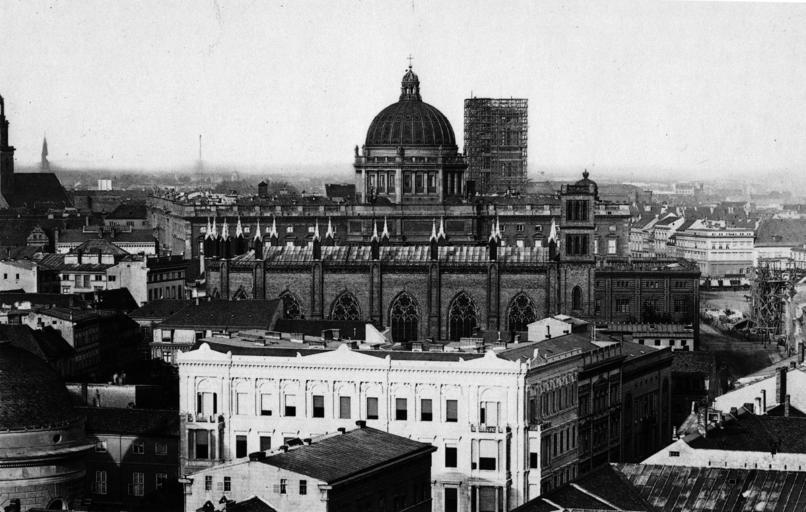 | Keywords: Berlin City Palace, 1866.jpg Das Berliner Stadtschloss hinter der Friedrichswerderschen Kirche Das Gerüst gehört zu dem im Bau befindlichen Berliner Rathaus The Berlin City Palace behind Friedrichswerder Church The scaffolding belongs to the construction site of the Berlin City Hall Berlin state archives<br/> Scanned from Janos Frecot Helmut Geisert Berlin in frühen Photographien 1857 “1913 Schirmer/Mosel Munich 1984 ISBN 3-88814-984-3 ca 1866 Friedrich Albert Schwartz Public domain PD-old Friedrich Albert Schwartz Friedrichswerdersche Kirche History of Rotes Rathaus Stadtschloss Berlin in the 19th century 1866 Berlin 1850-1880 1866 in Berlin |