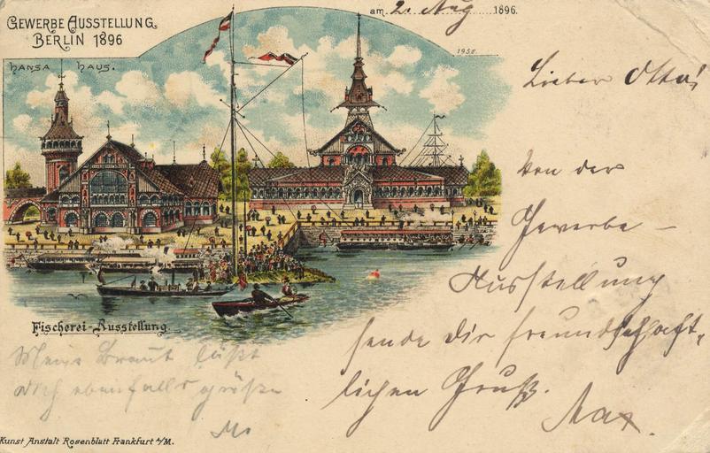 Keywords: Berlin, Treptow, Gewerbeausstellung 1896, Fischerei-Ausstellung.jpg old picture postcard of Berlin industrial exhibition 1896 in Treptower Park - view of fishery exhibition with Hansa-Haus alte Ansichtskarte zur Berliner Gewerbeausstellung 1896 im Treptower Park - Ansicht der Fischerei-Ausstellung mit dem Hansa-Haus http //www digitale-bibliothek de/scripts/ts dll s 6 id 1EBE9D6B mp /art/1722/ sc Deutschland htm Deutschland in alten Ansichten DVD-ROM 1896 publishing company Kunst Anstalt Rosenblatt Frankfurt a M PD because of age PD-old Berliner Gewerbeausstellung 1896 Postcards of Berlin-Alt-Treptow 1896 postcards of Germany Exhibition postcards Colored postcards Kunst Anstalt Rosenblatt