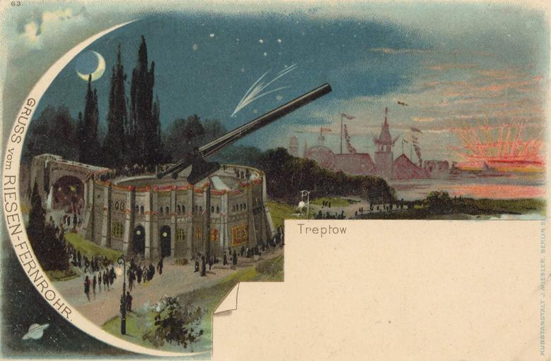 Keywords: Berlin, Treptow, Gewerbeausstellung 1896, Riesenfernrohr.jpg old picture postcard of Berlin industrial exhibition 1896 in Treptower Park - view of the giant long-glass today it is part of the Archenhold-Sternwarte alte Ansichtskarte zur Berliner Gewerbeausstellung 1896 im Treptower Park - Ansicht des Riesenfernrohres Heute ist es Teil der Archenhold-Sternwarte http //www digitale-bibliothek de/scripts/ts dll s 6 id 1EBE9D6B mp /art/1722/ sc Deutschland htm Deutschland in alten Ansichten DVD-ROM 1896 publishing company Kunstanstalt J Miesler Berlin S PD because of age PD-old Archenhold-Sternwarte Berliner Gewerbeausstellung 1896 Postcards of Berlin-Alt-Treptow 1896 postcards of Germany Exhibition postcards Telescopes in art Colored postcards Johannes Miesler
