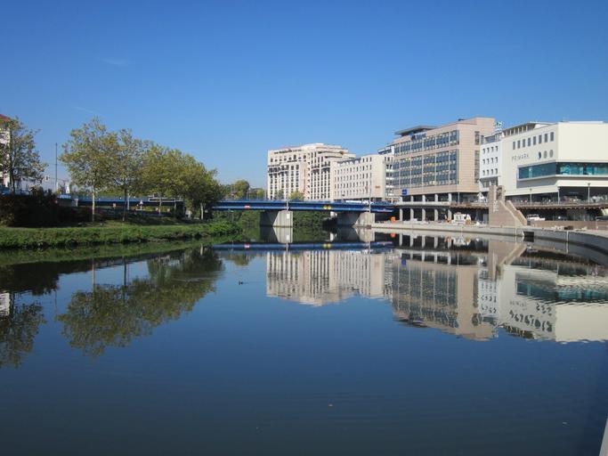 Keywords: berliner promenade saarbruecken saar river water reflection calm tranquil glassy city riverside