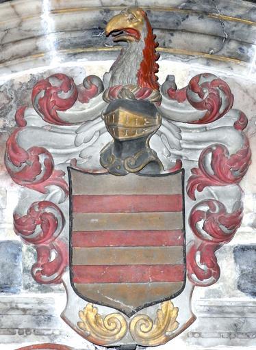 Keywords: BerryArmsMollandChurchDevon.JPG en Heraldic achievement of Rev Daniel Berry 1609-1654 vicar of Molland cum Knowstone on mural monument in Molland Church Devon erected in 1684 by his son Admiral Sir John Berry 1635-1689 Arms Or three bars gules which arms are depicted on the mural monument in Berrynarbor Church of Richard Berrie Esq 1582-1645 lord of the manor of Berrynarbor Crest A mythical bird's head and neck couped per pale argent and gules beaked or own photo Lobsterthermidor <span class signature-talk >talk</span> 18 38 4 May 2013 UTC 1684 photo 2013 St Mary's church Molland monuments Berry arms Heraldic memorials in the United Kingdom |