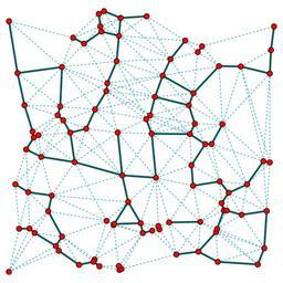 | Keywords: Beta-skeleton.svg β-skeletons of a set of 100 random points in a square The heavy dark edges are the β-skeleton for β 1 1 while the light dashed blue edges are the additional edges for β 0 9 own David Eppstein 2010-02-19 Source code This image was created with the following Python source code and then recolored and converted to SVG in Adobe Illustrator <source lang python > from pyx import canvas path color from math import from random import seed random seed 12345 npoints 100 radius 0 05 scale 5 beta1 1 1 beta2 0 9 theta1 asin 1/beta1 theta2 pi - asin beta2 points random scale random scale for i in range npoints def dot p q r return sum pi-ri qi-ri for i in 0 1 def sharp p q theta None for r in points if r not in p q prq acos dot p q r / dot p p r dot q q r 0 5 theta max theta prq return theta c canvas canvas def edge1 p q c stroke path line p0 p1 q0 q1 color rgb black def edge2 p q c stroke path line p0 p1 q0 q1 color rgb blue def point p c fill path circle p0 p1 radius color rgb red for p in points for q in points if p < q theta sharp p q if theta < theta1 edge1 p q elif theta < theta2 edge2 p q for p in points point p c writePDFfile Beta-skeleton </source> Computational geometry Files by User David Eppstein from en wikipedia Images with Python source code |