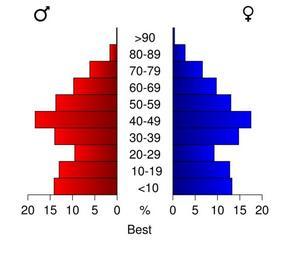 | Keywords: Bevolkingspiramide 2008 - CBS gemeentecode 0753.svg Age pyramids for the municipalities in the Netherlands 1/1/2008 Created in svg with own script Statistics provided by Centraal Bureau voor de Statistiek Voorburg/Heerlen Source Tabel Bevolking; burgerlijke staat geslacht leeftijd en regio 1 januari Tabeltoelichting Gewijzigd op 14 mei 2008 Verschijningsfrequentie per jaar http //statline cbs nl/StatWeb/publication/default aspx DM SLNL PA 03759NED D1 1-2 2c15 D2 118-128 D3 1-4 2c8-9 2c13-19 2c21 2c24 2c26 2c28-30 2c33-36 2c38-40 2c43-44 2c48-49 2c52 2c54 2c56 2c59 2c62 2c64 2c67-71 2c78 2c80-84 2c86-89 2c91 2c93-98 2c101 2c103-107 2c109 2c111-112 2c115 2c118-119 2c121-124 2c126-127 2c130 2c132-134 2c136 2c138-141 2c143-144 2c146 2c151 2c154 2c156-157 2c159-160 2c162-163 2c166-167 2c169 2c171 2c177-179 2c181-182 2c184 2c187-189 2c191-195 2c198 2c201 2c204-205 2c207 2c209 2c211 2c214 2c218-219 2c221-224 2c226 2c228-230 2c233 2c236 2c241-243 2c246-251 2c253 2c257-262 2c265 2c271-274 2c276 2c278 2c282 2c284 2c286-290 2c292 2c294 2c296 2c298-299 2c301-303 2c306 2c312-314 2c317-318 2c321-322 2c327 2c329 2c332 2c334-335 2c337 2c339 2c344-346 2c349-353 2c355-358 2c361 2c363-366 2c368 2c370-373 2c380 2c382-383 2c386-391 2c393-395 2c399 2c403-406 2c408-409 2c412 2c416-417 2c419 2c421-422 2c424 2c426-430 2c432-433 2c439-441 2c447-448 2c450-452 2c455-456 2c458-459 2c462-463 2c465 2c468-469 2c471 2c476 2c478-479 2c481-482 2c484-486 2c489 2c491-492 2c496 2c498-500 2c503 2c505-507 2c512-516 2c519-521 2c523-524 2c528-532 2c534 2c536 2c540 2c542-543 2c546-550 2c552-555 2c560-561 2c564-565 2c567-568 2c572-573 2c577-580 2c586 2c588-594 2c597 2c599-603 2c605 2c609-610 2c612-614 2c617 2c619 2c621-624 2c628 2c630-631 2c633 2c636-637 2c640 2c646-647 2c649-651 2c653 2c655-661 2c663-664 2c666 2c668-670 2c673 2c675-681 2c683-684 2c686 2c689-690 2c693 2c695-696 2c698 2c701-702 2c706-710 2c717 2c719 2c721-722 2c724-725 2c727 2c732-733 2c735-742 2c746 2c750-752 2c756-757 2c759 2c761 2c763-764 2c766-769 2c771-772 2c774-775 2c777 2c779 2c783 2c785-788 2c791-793 2c796-797 D4 l HDR T STB G1 2cG2 2cG3 VW D StatLine own work using CBS data 2009-01 Michiel1972 Own work all rights released Public domain Population pyramids of municipalities of the Netherlands 2008 |