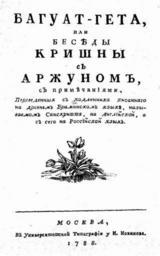Keywords: Bhagavad Gita (ru 1).jpg en Bhagavad Gita The first Russian translation ru В России ши око о «Бхагавад-гите» узнали в 1788 году после того как её впе вые на усском языке издал И овиков Книга вышла под следующим названием «Багуат-гета или беседы К ишны с А джуном с п имечаниями Пе еведенныя с подлинника писанного на д евнем Б аминском языке называемом Санск ита на Английский а с сего на Российский язык» Гамаюнов Л С Из исто ии изучения Индии в России К воп осу о деятельности Г С Лебедева // Оче ки по исто ии усского востоковедения 1956 Т 2 С 84 Типог афия И овикова 1788 PD-old-100 Bhagavad Gita Cyrillic writing
