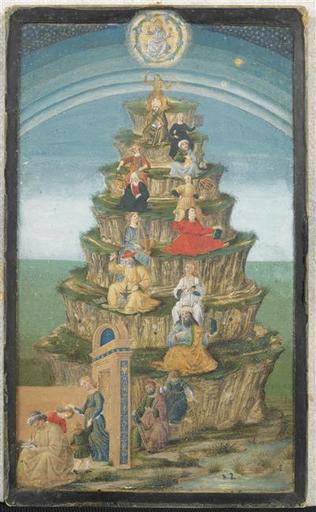 Keywords: photo border Firenze. 20x10 cm. Chantilly, Musée Condé. DANSK/ENGLISH: "Denne florentinske miniature placerer de kvindelige personifikationer af de syv frie kunster på en stejl bjergsti. Motivet understreger, at beherskelse af de frie kunster er hårdt arbejde; studerende skal forcere en stejl bakke for at nå toppen for al viden om dette. I denne historiske fase var målet for de frie kunster en forberedelse til studiet af teologi, og det er den allegoriske figur Teologia, vi ser her på bjergtop på baggrund af de planetariske sfærer, pegende op mod Gud. Nedenfor hende ses hver af personifikationerne med attribut og en historisk figur berømt for udøvelsen af relevante kunst. Ved porten til bjerget ledsages Grammatica ledsaget af den romerske grammatiker Donatus (4. århundrede e.Kr.). Med dem er de to små drenge, der ofte fungerer som Grammaticas attributter. Dernæst ses Aritmetica, som tæller sivene langs bjergsiden og ledsages af Pythagoras (6. århundrede f.Kr.). Logica følger, holder en skorpion som attribut og ledsages af filosoffen Zeno (5. århundrede f.Kr.). Efter Logica kommer Musica, med et lille orgel på skøddet og ledsages af den bibelske musiker Tubalkain, som frembringer perfekte harmonier på sin ambolt (Første Mosebog 4:22). Astronomia følger Musica og holder en armillarsfære. Hun er ledsaget af den gamle alexandrinske astronom, Ptolemæus (2. århundrede e.Kr.). Efter Astronomia kommer Geometria, hvis attribut er en passer. Hun ledsages af Euklid (4. århundrede f.Kr.). Derpå følger Retorica er med en bog. Hun gestikulerer, som om hun holder en tale. Med hende er den romerske taler Cicero (1. århundrede f.Kr.). Teologia sidder på toppen af bjerget, iført en guldkjole. Hun holder et symbol på Treenigheden og er ledsaget af Sankt Thomas af Aquinas." www2.naz.edu/dept/philosophy/liberal-arts-resources/class... "This Florentine miniature situates the female personifications of the Seven Liberal Arts on an ascending mountain path. The arrangement emphasizes that mastery of the Liberal Arts is hard work; students must climb a steep hill in order to reach the summit of all knowledge. At this point in history, the goal of the Liberal Arts was preparation for the study of theology, and it is the allegorical figure of Theology we see here on the mountaintop against a background of the planetary spheres and pointing up toward God. Below her, each of the seven Liberal Arts appears with her identifying attribute and a historical figure famous for the practice of her Art. At the gateway to the mountain is Grammar accompanied by the Roman Grammarian Donatus (4th century AD). With them are the two small boys that often serve as Grammar’s attribute. Next is Arithmetic, counting the reeds along the mountainside and accompanied by Pythagoras (6th century BC). Logic follows, holding a scorpion and accompanied by the philosopher Zeno (5th century BC). After Logic comes Music, with a small organ on her lap and accompanied by the biblical musician Tubal Cain, who is sounding perfect harmonic proportions on his anvil (Genesis 4:22). Astronomy follows Music, holding an Armillary sphere and accompanied by the ancient Alexandrian astronomer, Ptolemy (2nd century AD). After Astronomy comes Geometry, who holds a compass and is accompanied by Euclid (4th century BC). Rhetoric is next, holding a book and gesturing as though she is making a speech. With her is the Roman orator Cicero (1st century BC). Theology is seated at the summit of the mountain, wearing a gold dress and holding a symbol of the Trinity. She is accompanied by St. Thomas Aquinas." www2.naz.edu/dept/philosophy/liberal-arts-resources/class... Firenze. 20x10 cm. Chantilly, Musée Condé. DANSK/ENGLISH: "Denne florentinske miniature placerer de kvindelige personifikationer af de syv frie kunster på en stejl bjergsti. Motivet understreger, at beherskelse af de frie kunster er hårdt arbejde; studerende skal forcere en stejl bakke for at nå toppen for al viden om dette. I denne historiske fase var målet for de frie kunster en forberedelse til studiet af teologi, og det er den allegoriske figur Teologia, vi ser her på bjergtop på baggrund af de planetariske sfærer, pegende op mod Gud. Nedenfor hende ses hver af personifikationerne med attribut og en historisk figur berømt for udøvelsen af relevante kunst. Ved porten til bjerget ledsages Grammatica ledsaget af den romerske grammatiker Donatus (4. århundrede e.Kr.). Med dem er de to små drenge, der ofte fungerer som Grammaticas attributter. Dernæst ses Aritmetica, som tæller sivene langs bjergsiden og ledsages af Pythagoras (6. århundrede f.Kr.). Logica følger, holder en skorpion som attribut og ledsages af filosoffen Zeno (5. århundrede f.Kr.). Efter Logica kommer Musica, med et lille orgel på skøddet og ledsages af den bibelske musiker Tubalkain, som frembringer perfekte harmonier på sin ambolt (Første Mosebog 4:22). Astronomia følger Musica og holder en armillarsfære. Hun er ledsaget af den gamle alexandrinske astronom, Ptolemæus (2. århundrede e.Kr.). Efter Astronomia kommer Geometria, hvis attribut er en passer. Hun ledsages af Euklid (4. århundrede f.Kr.). Derpå følger Retorica er med en bog. Hun gestikulerer, som om hun holder en tale. Med hende er den romerske taler Cicero (1. århundrede f.Kr.). Teologia sidder på toppen af bjerget, iført en guldkjole. Hun holder et symbol på Treenigheden og er ledsaget af Sankt Thomas af Aquinas." www2.naz.edu/dept/philosophy/liberal-arts-resources/class... "This Florentine miniature situates the female personifications of the Seven Liberal Arts on an ascending mountain path. The arrangement emphasizes that mastery of the Liberal Arts is hard work; students must climb a steep hill in order to reach the summit of all knowledge. At this point in history, the goal of the Liberal Arts was preparation for the study of theology, and it is the allegorical figure of Theology we see here on the 