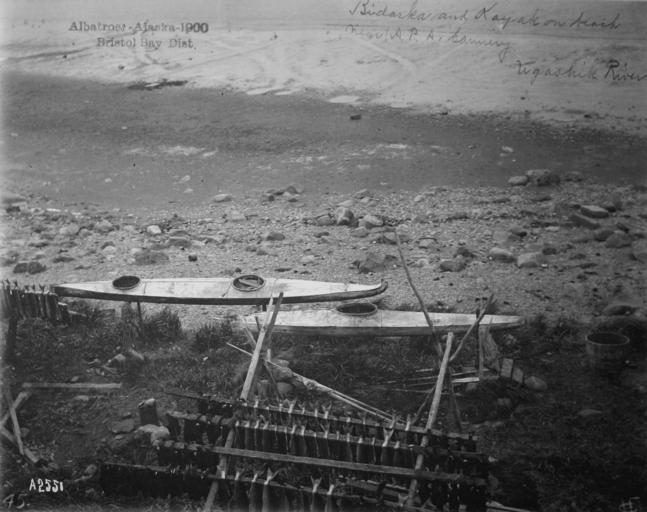 | Keywords: Bidarka kayak and salmon.jpg en Bristol Bay district Alaska Bidarka and kayak on beach near A P A cannery Ugashik River The rack in the foreground appears to hold drying fish fillets probably salmon Credit Gulf of Maine Cod Project NOAA National Marine Sanctuaries; Courtesy of National Archives NOAA Photo Library NOAA's Historic Fisheries Collection fish7600 http //www photolib noaa gov/htmls/fish7600 htm Original photographer not named; US Fish commission steamer Albatros; Archival Photographer Stefan Claesson 1900 PD-USGov Inuit kayaking Inuit food Bristol Bay Alutiiq Yupik 1900 in Alaska Baidarkas Beaches of Alaska |