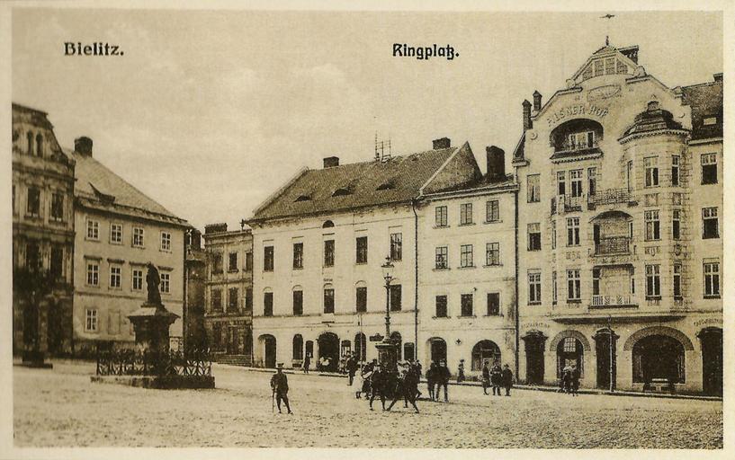 Keywords: Bielsko-Biała Rynek 005.JPG Rynek w Bielsku-Białej północno-zachodni narożnik Rynku Bielsko-Biała Nordwestecke des Platzes Scan aus dem Buch Monika Ćwikowska-Broda und Wiesław Ćwikowski Bielsko-Biała i okolice - historia pocztówka pisana / Bielitz-Biala und Umgebung - Geschichte mit Ansichtskarten geschrieben / Bielsko-Biała and Surroundings - The History Depicted by Postcards Oficyna Wydawicza M-C Bielsko-Biała ISBN 978-83-926877-0-2 ungenannt ~ 1914 PD-old Market Square in Bielsko-Biała Old Postcards of Bielsko 1914 postcards |