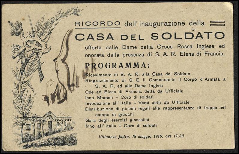 Keywords: Biglietto di Ricordo dell'inaugurazione della Casa del Soldato.jpg Alcuni anni fa ho ritrovato del tutto casualmente in una soffitta tra le vecchie carte del capitano Adelmo Lolli di Bastia Umbra Perugia fratello di mio nonno materno una serie di bellissime cartoline da lui raccolte e alcune fotografie da lui scattate durante la Prima Guerra mondiale Mio prozio il capitano Adelmo Lolli era uno studente di ingegneria ed apparteneva all ™11° Reggimento Fanteria “ Brigata CASALE “ 6 Compagnia - 12 Divisione Era nato a Bastia Umbra Perugia il 29 maggio 1895 ed è morto a Bastia Umbra Perugia a 24 anni il 9 novembre 1919 proprio a seguito di una grave malattia contratta in guerra Appassionato di foto documentò in particolar modo due luoghi l'altopiano di Asiago e la zona di Gorizia nel corso della sua presa Il suo nome compare nell'albo d'oro dei caduti dell'Umbria Riferimenti http //www cadutigrandeguerra it/Albo_Oro/Archivi/25/183 jpg exhibition history object history object type Europeana 1914-1918 Copyright information Europeana 1914-1918 PD-own upload Europeana claims no rights in its digitisation in accordance with its http //pro europeana eu/publications/the-europeana-public-domain-charter Public Domain charter Europeana 1914-1918 project place of creation place of discovery http //www europeana1914-1918 eu/en/contributions/5577 Biglietto di Ricordo dell'inaugurazione della Casa del Soldato Uploaded with GWToolset Biglietto di Ricordo dell'inaugurazione della Casa del Soldato http //www europeana1914-1918 eu/attachments/161195/5577 161195 full jpg World War I World War I homefront Europeana 1914-1918 batch upload needs checking |
