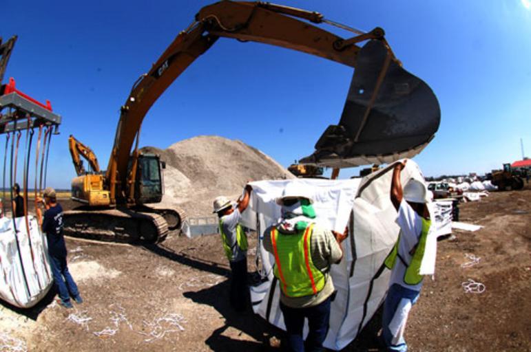 Keywords: BigSandBagNOLALevees.jpg Contractors under the guidance of the U S Army Corps of Engineers fill bags of sand in New Orleans La on Sept 7 2005 The bags are being used to plug levees that burst during Hurricane Katrina and caused devastation within the city leaving thousands either homeless or dead U S Navy photo by Petty Officer 1st Class Robert McRill <p> From structures visible in the background in this and the accompanying photo the location is by the 17th Street Canal breach U S Navy photo by Petty Officer 1st Class Robert McRill via pentagon gov at http //www pentagon gov/home/photoessays/2005-09/p20050909a1 html 2007-09-07 U S Navy photo by Petty Officer 1st Class Robert McRill PD-USGov 17th Street Canal after Katrina Sandbags Flexible intermediate bulk containers Photographs by Robert R McRill |
