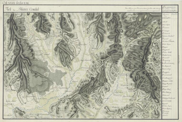 | Keywords: BihorSolnocCrasna Josephinische Landesaufnahme pg27-22.jpg wikitable style margin 1em auto 1em auto width 80 Name shown on the map<br>Nume din hartă Administrative unit<br>Unitate administrativă Romanian name<br>Numele românesc Hungarian name<br>Numele unguresc German name<br>Numele german Country today<br>Ţara de astăzi - Albest Bihar Albeşti Fehérlak Albest Romania - Alsó Topa Bihar Topa de Jos Alsótopa Romania - Bucsum Bihar Bucium Tőkefalva Bucsum Romania - Cseiszar Bihar Ceişoara Cseszvára Cseisora Romania - Doberest Bihar Dobreşti Dobreşti-Govoreşti Bihardobrosd Dobrest Romania - Gÿoszan Gürbesd Bihar Gurbeşti Görbesd Romania - Dusesd Bihar Duşeşti Dusafalva Dusest Romania - Farkas Pataka Bihar Lupoaia Farkaspatak Farkaspataka Farkasmező Romania - Felsö Topa Bihar Topa de Sus Felsőtopa Romania - Hegyes Bihar Hidiş Hegyes Romania - Hegyeel Bihar Romania - Hidastelek Bihar Holod Pusztahollód Hollód Hidastelek Romania - Hollod Venter Bihar Holod Hollód Romania - Jancsesd Bihar Inceşti Ianceşti Jancsófalva Jancsesd Romania - Kimpány Bihar Câmpanii de Jos Alsómezős Alsókimpány Fonókismezős Romania - Kis Dombrawicza Bihar Dumbrăviţa Dumbrăviţa-mică Kisdombró Kisdombravica Kisdombrovica Romania - Kis Kerepest Bihar Cornişeşti Cornişeştii Cârpeştii-mari Nagykerpesd Kerpesd Nagykerpest Romania - Kopocsány Bihar Copăceni Kapocsány Romania - Krainicsest Bihar Crânceşti Karáncsfalva Kráncsesd Romania - Lunkaszprie Bihar Luncasprie Lunca Sprie Lankás Lunkaszprie Romania - Magyar Cséke Bihar Ceica Magyarcséke Cséke Romania - Nagy Kerpest Bihar Cornişeşti Nagykerpesd Romania - Orosesd Bihar Romania - Pappmezõ Bihar Pomezeu Pomezău Popmezeu Kispapmező Papmező Romania - Petr Vattány Bihar Romania - Rotaresd Bihar Rotăreşti Kerekesfalva Romania - Szitány Turburest Bihar Sitani Sitani-Turbureşti Szitány Szitány-Turburest Romania - Szomborság Bihar Sâmbăta Sâmbăşag Szombatság Romania - Topest Bihar Topeşti Toposd Romania - Venter Rogócz Bihar Rogoz Rogozi Venterrogoz Romania - Vent Rogocz Bihar Romania - Veresany Bihar Vărăşeni Crişeni-Vărăşeni Veresfalva Varosány Romania - Krisany Bihar Crişeni Varosány Romania - Spinus Bihar Spinuş de Pomezeu Spinuş Spinuş-Pomezeu Spinuş-Pomezău Tősfalva Szpinu Romania - Bihor County 1782-85 Josephinische Landesaufnahme pg 27-22 Harta Iosefină a Comitatului Bihor 1782-85 Josephinische Landesaufnahme pg 27-22 Österreichisches Staatsarchiv Kriegsarchiv Historische Militärkarte der österreichisch-ungarischen Monarchie 1782-1785 PD-old-100 Clickable Map of the Bihor Solnoc Crasna County BihorSolnocCrasnaCountyJosephinischeLandesaufnahme1782-85 Josephinische Landaufnahme |