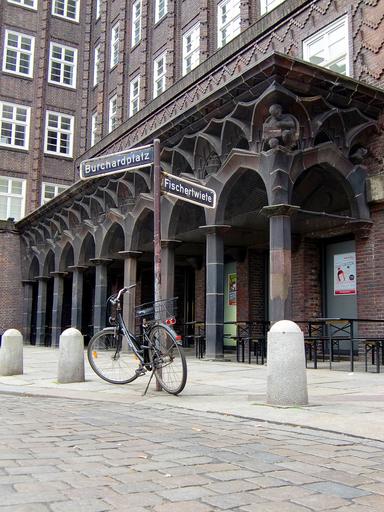 Keywords: bike park completed turned off parking space wheel turn off parking possibility building historically columnar arcades antique old hamburg
