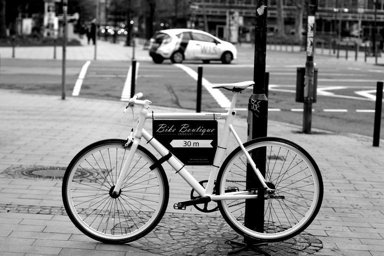 | Keywords: bike road bike racing cyclists black and white cyclists ad advertising sign shield road business street sign eye catcher city financial district business district urban frankfurt economy retail trade sale note signal shop retail store pavement junction patch main caption |