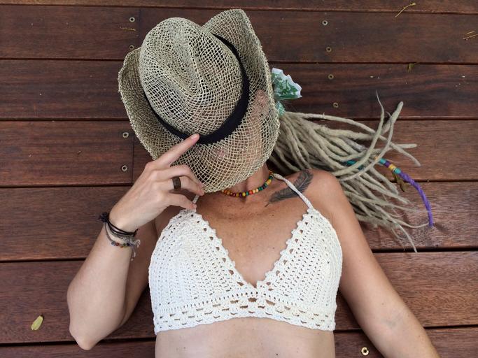 Keywords: bikini woman swimwear dreadlocks dreads female hat outdoors bralette