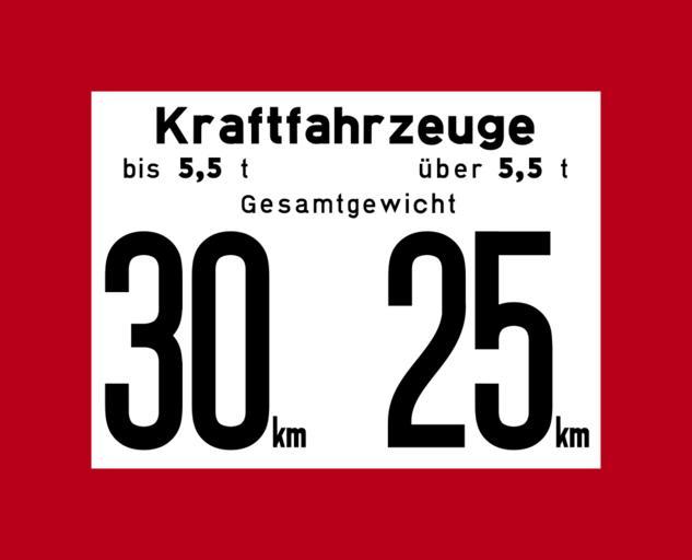 Keywords: Bild 72 - Zeichen für Geschwindigkeitsbeschränkungen bis 5,5 t auf 30 km und über 5,5 t auf 25 km, StVO 1937.svg de Bild 72 Zeichen für Geschwindigkeitsbeschränkungen bis 5 5 t auf 30 km und über 5 5 t auf 25 km Deutsches Verkehrszeichen nach dem Reichsgesetzblatt 123 vom 16 November 1937 S 1213 Außerdem identisch in Reichsgesetzblatt Jahrgang 1934 Nr 112 Tag der Ausgabe Berlin 9 Oktober 1934 S 908 Das Zeichen findet sich zudem in der Berliner Straßenordnung vom 15 Januar 1929 Anlage IV own selbst gezeichnet von Mediatus Mediatus 14 November 2015 Herstellungsdatum Other fields + Signs Cc-zero PD-VzKat German language signs Square signs Location not applicable Diagrams of historic road signs of Germany 1929 set Diagrams of miscellaneous road signs of Germany 1934 set Diagrams of deprecated road signs of Germany 1938 set 71 SVG road signs in Germany |