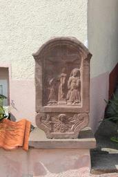 Keywords: Bildstockaufsatz Helmstadt, Sankt-Martinstraße 7.jpg de Sandstein mit Pietà-Relief 18 Jahrhundert eingemauert Aktennummer D-6-79-144-6 Wurde 1933 in Gartenmauer eingelassen Kreuzigungsszene mit Jesus am Kreuz und Maria und Johannes daneben 2016-07-16 15 36 29 own Michael Schätzlein other versions 49 76208 9 70853 cc-zero Wayside shrines in Landkreis Würzburg Cultural heritage monuments in Helmstadt |