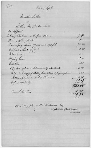 Keywords: Bill of Costs on Appeal in the case of Martin Luther v. Luther Borden, et. al. - NARA - 278291.tif Scope and content This document is from the file for the case of Martin Luther v Luther Borden This is a suit for trespass against a group of Rhode Island state militia who acting under martial law broke into Martin Luther's house in the middle of the night searched the premises and threatened its inhabitants Luther claimed that the legislation establishing martial law was void because the charter government which proclaimed martial law was not the legal government of Rhode Island The defendents claimed that the declaration of martial law was legal and that they were acting under the orders of their superior officers when they entered the house to search for Luther who was an important supporter of Thomas W Dorr who had organized a people's government The decision of the US Circuit Court in favor of the defendents was appealed to the US Supreme Court The US Supreme Court however feeling that the case was political in nature refused to rule on the issues and returned the case to the US Circuit Court This case was an important case in the historic events commonly known as the Dorr Thomas W Dorr Rebellion General notes 278291 Local identifier U S Circuit Court for the District of Rhode Island 1790 - 01/01/1912 NARA's Northeast Region Boston NRAAB 380 Trapelo Road Waltham MA 02452-6399 Record group Record Group 21 Records of District Courts of the United States 1685 - 2004 Record group ARC 350 Case Files compiled 11/1790 - 12/1911 Series ARC 278236 File unit Martin Luther v Luther Borden et al 10/06/1842 - 12/1848 File unit ARC 278271 Variant control numbers NAIL Control Number NRAB-21-CASECCRI-24LAW-T yes Other versions NARA-cooperation PD-USGov Luther v Borden |