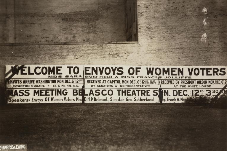Keywords: Billboard signs welcoming suffrage envoys 159033v.jpg Summary Photograph of billboard signs on brick wall welcoming arrival of Congressional Union automobile envoys in Washington D C Welcome to envoys of women voters Mrs Sara Bard Field Miss Francis Jolliffe Envoys arrive Washington Mon Dec 6th 12 noon Stanton Square 4th St MD Ave N E Received at Capitol Mon Dec 6th 12 30 P M East Steps by Senators Representatives Received by President Wilson Mon Dec 6th 2 P M at the White House Mass Meeting Belasco Theatre Sun Dec 12th 3 30 P M Speakers Envoys of Women Voters Mrs O H P Belmont Senator Geo Sutherland Rep Frank W last name obscured 1 photograph print 5 x 7 in accession number Call Number Location National Woman's Party Records Group I Container I 159 Folder Envoys from San Francisco Source Collection Records of the National Woman's Party institution Library of Congress Manuscript Division http //hdl loc gov/loc mss/mnwp 159033 PD-1923 PD-Harris-Ewing suffragettes Billboards in Washington D C December 1915 in Washington D C |