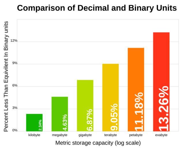 Keywords: Binaryvdecimal.svg en This chart shows the growing percentage of the shortfall of decimal interpretations from binary interpretations of the unit prefixes plotted against the logarithm of storage size Example uses multiple units of bytes own Ryoushi19 <gallery> File Binaryvdecimal fr svg Français File Binary-decimal ka svg ქართულად File Binaryvdecimal mk svg акедонски File Binaryvdecimal-fi svg Suomi </gallery> ValidSVG Translation possible Technical diagrams Data management |