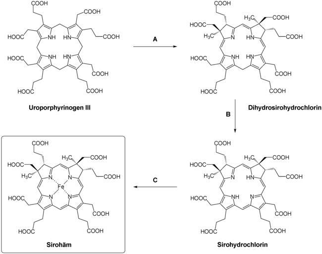 Keywords: Biosynthesis Siroheme.png en Biosynthesis of Siroheme de Biosynthese von Sirohäm own Yikrazuul 9 9 08 Biosynthesis Siroheme svg Coenzymes Coordination compounds Iron complexes Porphyrins