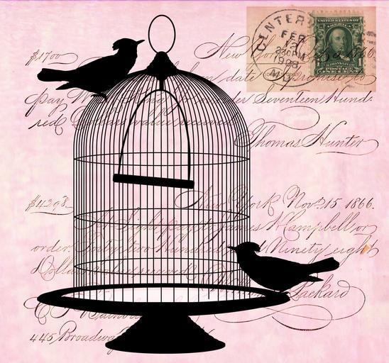 Keywords: bird birds black silhouette birdcage cage vintage victorian script handwriting postmark postage stamp pink background card art