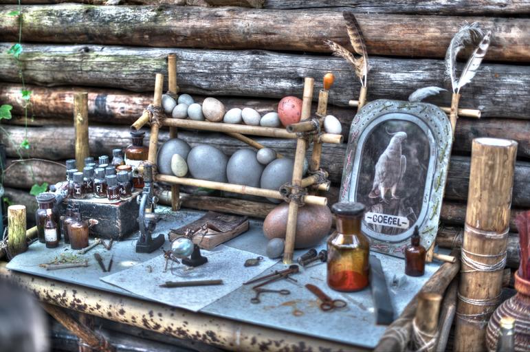 Keywords: bird feather eggs quack table jars spices chemicals hdr high dynamic range depth