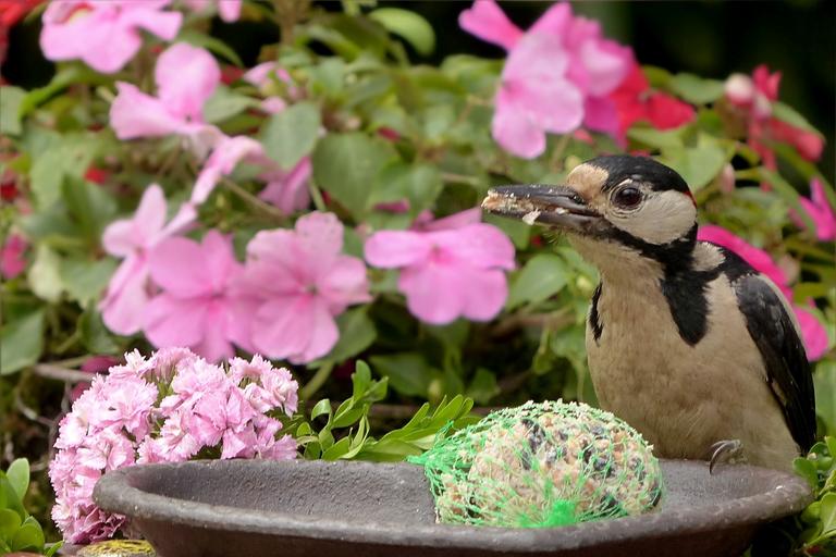 Keywords: bird great spotted woodpecker dendrocopos major feeding place garden