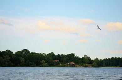 Keywords: bird seagull animal water bird sea coast background sky clouds cloud blue house