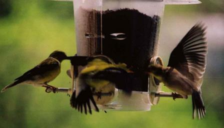 Keywords: Birds0020c.jpg Goldfinch at feeder Own 2007-07-04 Lsi john Bird feeding Spinus tristis