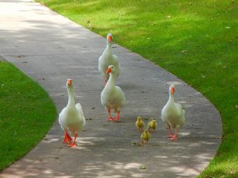 Keywords: birds goose nature family ducklings walking fauna orange beak yellow feathes white feathers