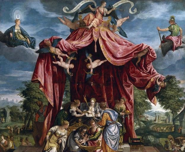 Keywords: Birth of Ferdinand, Prince of Asturias.jpg Artwork Creator Parrasio Micheli This painting describes in an allegorical way the birth of Ferdinand the son of Philip II of Spain circa 1575 oil on canvas cm 128 223 Institution Prado Madrid Prado Museum Official Website <small> See below </small> object history langSwitch Alegoría del nacimiento del infante don Fernando hijo de Felipe II representado en un niño rodeado de siete damas las Virtudes teologales y las cardinales delante de un lecho donde yace una dama alusiva a su madre Ana de Austria en un esquema compositivo basado en los nacimientos religiosos La escena está enmarcada por un gran cortinaje sujeto por siete putti y sobre el cual se asienta la Fama tocando la trompeta y portando un rótulo con la leyenda celebris mundi veneris partus Se celebra en el mundo el parto de Venus A los lados sobre nubes y acompañados de un águila aparecen Lucina la diosa romana de los partos y Marte el dios romano de la guerra Allegory of the birth of the Infante Ferdinand son of Philip II represented as a child surrounded by seven women the theological and cardinal virtues in front of a bed on which there is a lady alluding to his mother Anne of Austria in a compositional scheme based on a religious birth The scene is framed by a large curtain of seven putti subject and on which rests the fame playing the trumpet and holding a sign with the legend Celebris veneris partus mundi takes place in the world the birth of Venus On the sides on clouds and accompanied by an eagle displayed Lucina the Roman goddess of childbirth and Mars the Roman god of war credit line accession number P00479 http //www museodelprado es/coleccion/galeria-on-line/galeria-on-line/obra/alegoria-del-nacimiento-del-infante-don-fernando-hijo-de-felipe-ii/ Prado Museum Online Gallery PD-old-100 Uploaded with UploadWizard Parrasio Micheli Anna of Austria 1549-1580 Ferdinand Prince of Asturias Heirs apparent who never acceded 16th-century allegorical paintings Lucina goddess Paintings of Mars Putti |