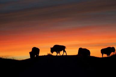 Keywords: bison buffalo sunrise american silhouettes animal wildlife nature sky colorful orange dawn mammals walking herd hills beasts icon horns fur horizon yellowstone national park wyoming usa