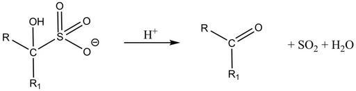 Keywords: BIsulfit rück.png en schematic illustration of the reversibility of the Bisulfit reaction de Schematische Darstellung der Reversibilität der Bisulfit-Reaktion own Avolutionx Cc-zero Elimination reactions
