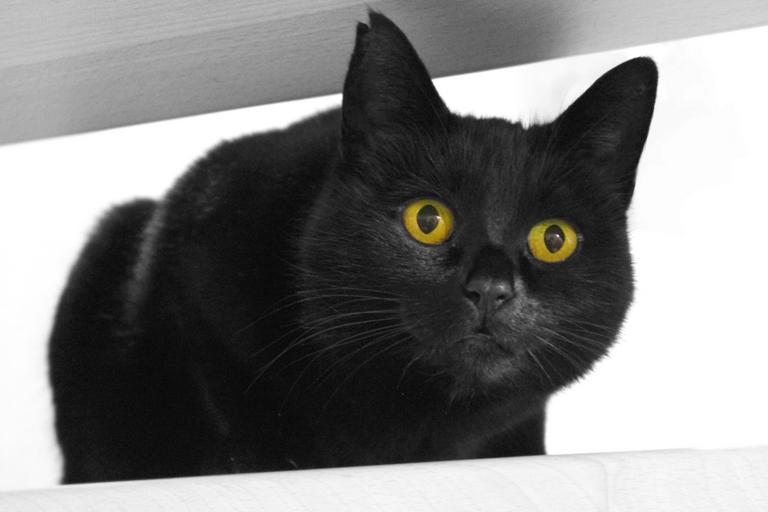 Keywords: black cat looking domestic feline animal portrait close kitty eyes fur adorable pet