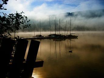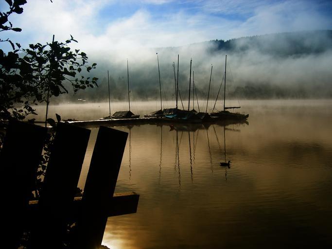 Keywords: black forest lake titisee germany atmosphere boats leaves light moment nature fog october orange red sun mirroring hiking day water away
