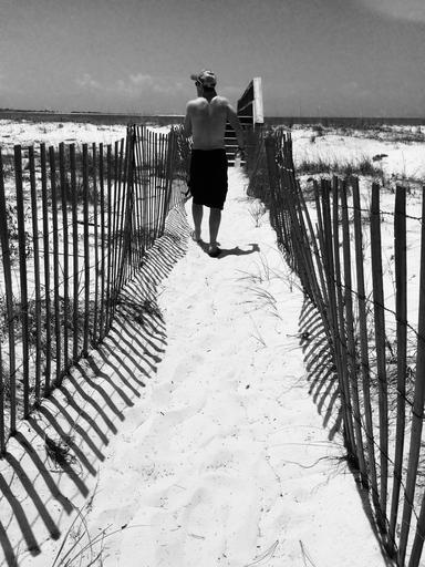 Keywords: black white sand fence male walking ocean peaceful creative nature summer